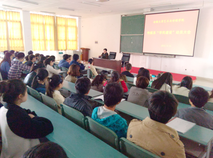 为积极响应学院教学和学生管理检查工作,发挥广大青年学子主体作用,大力加强学风建设,4月13日,传媒系召开学风建设动员大会。系主任助理吴梦东、学管秘书刘勇、教学秘书李倩、各辅导员以及系学生会成员、班干、寝室长、楼层长共100余人参加会议。