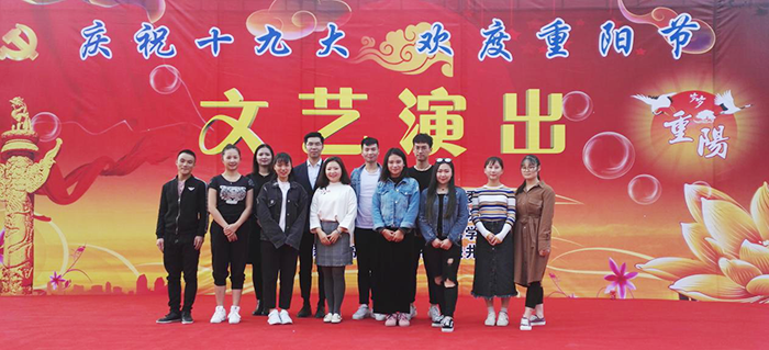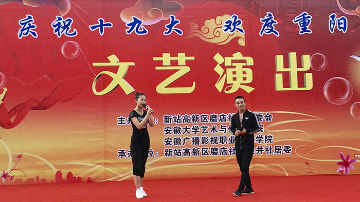 为庆祝党的十九大胜利召开,深入学习宣传贯彻十九大精神,展现新站高新区良好的发展面貌,引领艺术专业学生积极践行马克思主义文艺观,10月26日,学院和新站高新区磨店社区管委会联合举办了以“庆祝十九大 欢度重阳节”为主题的文艺演出活动。