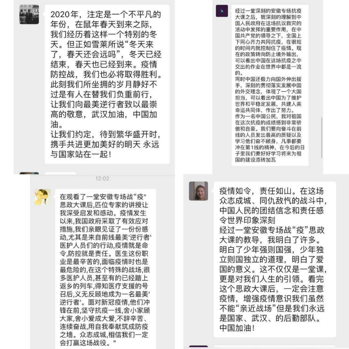 在4月24日上午组织的线上观看讨论中,同学们纷纷表示:防控就是最好的课堂,战“疫”思政大课就是最生动的教科书。2019级油画二班本科生刘钰说:“此次家乡专场的课程让我受益匪浅。作为一名大学生,虽然我不能在一线战场与病毒“厮杀”,但我通过此次疫情学习了当代青年人不畏艰险、冲在前锋的精神,在今后的学习中要努力增长工作本领,在祖国需要的地方绽放自己的光芒。”