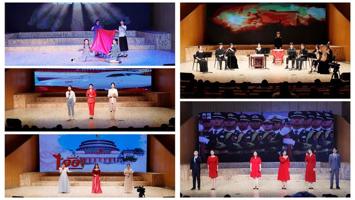 音乐厅内,唢呐一开腔便紧紧抓住了观众们的心。《十送红军》在古典乐器的演奏下悠扬而又凄婉,表达了革命根据地人民对红军的深厚感情。“千层情,万人爱,化作金星绣红旗......”江姐扮演者阮雨洁和其他三位表演者用黄梅腔演绎狱中的革命乐观主义精神。19级播音专业同学们带来了深情朗诵《赵一曼家书》《恰似百年风华》,低缓的音乐里,饰演赵一曼的赵亦然吐露一个母亲对孩子的深切爱意和未能陪孩子长大的遗憾。旁白周宇轩的动情诉说和另外两位学生声情并茂的表达,让现场观众几度哽咽。