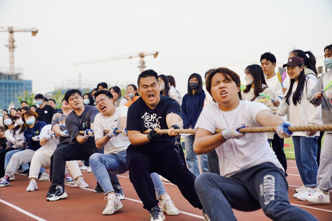 “加油!加油!”傍晚的运动场总是先声夺人、热闹非凡。“绳彩飞扬”拔河总决赛在主席台前一决胜负。从排兵布阵开始,双方就不放过每一处细节,戴手套、交错站、绳子缠腰上……连啦啦队的口号和手势都精心设计,配合着本班队员拔河的节奏。拉扯的是一根绳,拉近的是一个班、一个系的心。
