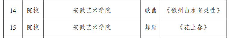 近日,学校从安徽省文化和旅游厅获悉,我校推荐的歌曲《徽州山水有灵性》(负责人:纪恺)、舞蹈《花上春》(负责人:李玉煜)从众多申报项目中脱颖而出,成功入选2024年安徽省舞台艺术优秀节目创作扶持计划。我校入选作品数量在所有申报单位中排名第二。