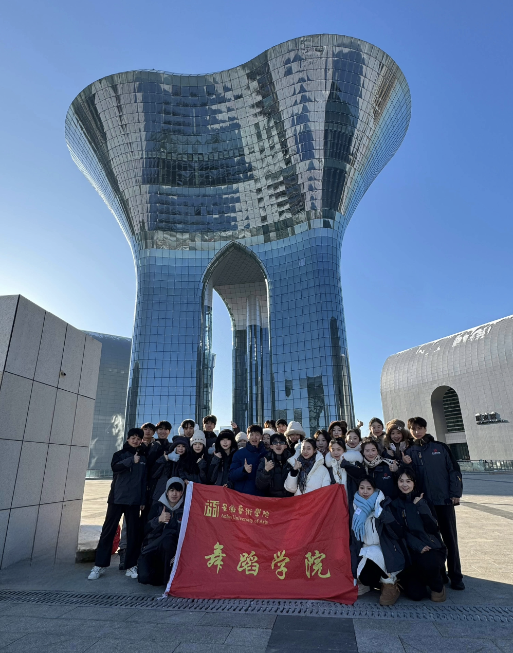 我校舞蹈学院师生应邀参演,学院特聘院长戴虎教授担任展演评审,安徽省舞蹈家协会主席王成受邀带队观礼。29名师生克服零下二十摄氏度的严寒挑战,以青春的活力和扎实的专业功底,饱满的热情和精湛的技艺,向全国观众展现了安徽非遗舞蹈的独特魅力。选送作品安徽花鼓灯传统节目《大花场》以欢快的鼓点、灵动的舞姿和浓郁的乡土气息,赢得了观众的热烈掌声,并荣获特邀节目奖,成为本次展演的一大亮点。