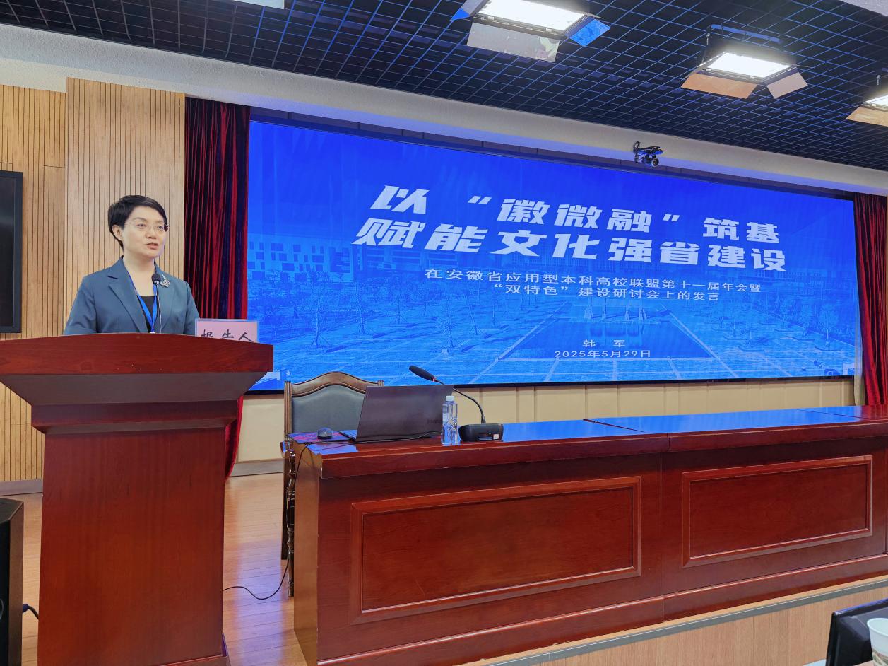 校党委书记韩军作了题为《以“徽微融”筑基 赋能文化强省建设》的专题报告。她在报告中系统阐述了安徽艺术学院立足地方性、应用型、特色化发展定位,以“徽”文化为根脉,推动“微”专业建设与产教“融”合创新的特色发展路径。她重点介绍了学校在学科专业特色和人才培养特色建设方面的探索与实践,包括优化专业布局、深化校地合作、强化实践教学等举措,旨在培养适应文化产业发展的高素质应用型艺术人才,为安徽文化强省建设提供有力支撑。