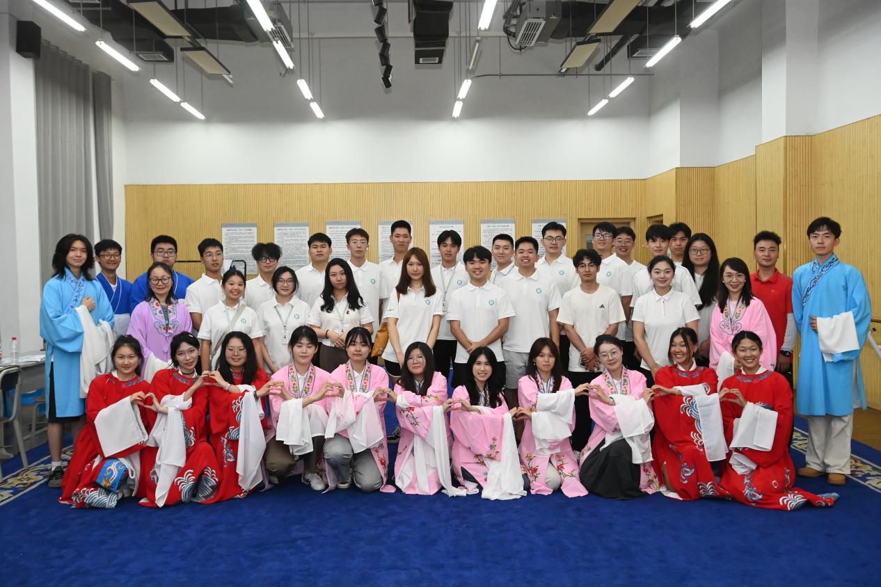 8月7日下午,参加“徽风探源——2025华裔大学生中国文化体验营”的32位华裔大学生走进我校,在专业教师的指导下学习黄梅戏经典唱段和传统武术。校党委委员、纪委书记、监察专员程宗林出席活动。