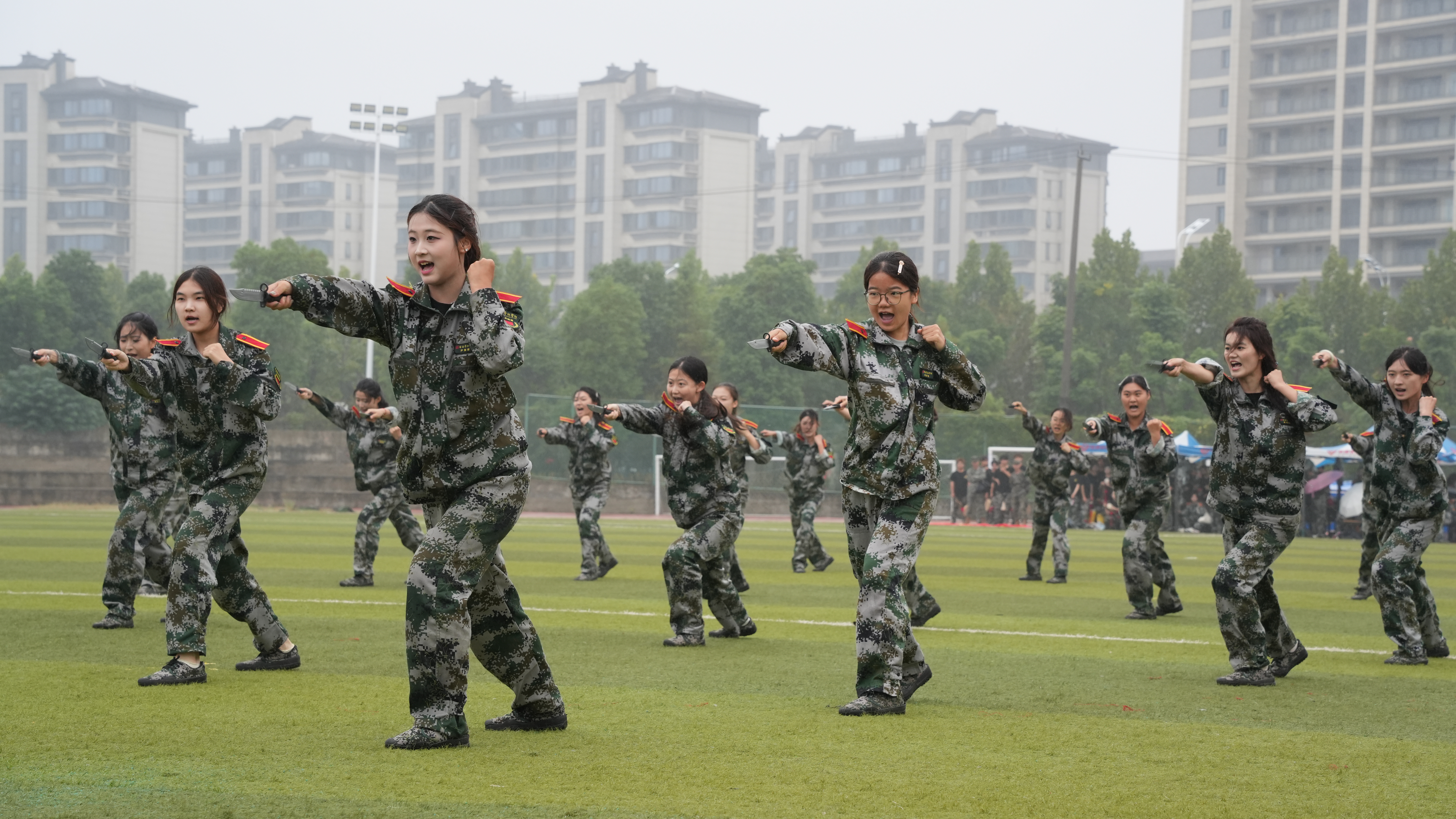 随后,各营连方队依次入场受阅。新生身着统一迷彩服,口号嘹亮、步伐铿锵、目光坚定,以饱满的精神状态走过主席台。整齐的队列、刚劲的动作、响亮的口号,充分展现军训丰硕成果,赢得现场领导与师生阵阵掌声。