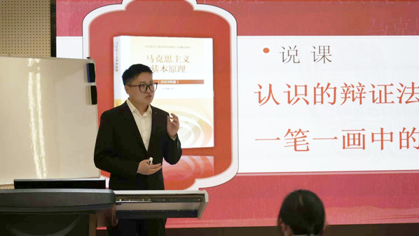 马克思主义学院冯戎以《蒙娜丽莎》、徽州采风案例,阐释感性认识与理性认识的辩证关系及第一次飞跃。他借AI生成图像制造认知冲突,结合青铜器案例,解读“从理性到实践”的第二次飞跃。