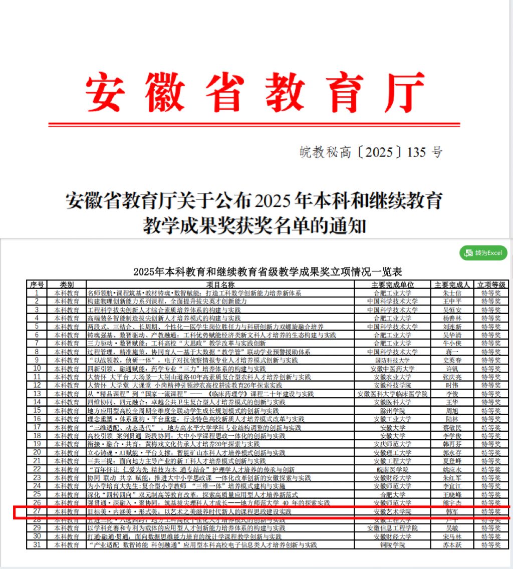 近日,安徽省2025年本科教育教学成果奖评选结果正式揭晓,由校党委书记韩军领衔的《目标美·内涵美·形式美:以艺术之美滋养时代新人的课程思政建设实践》获特等奖。这是我校继2023年后再次荣获特等奖,实现了学校在该奖项上的连续突破,彰显了我校的育人特色。