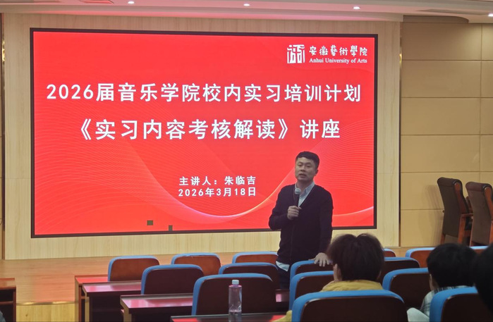 3月18日,音乐学院2026届毕业实习校内实习培训计划之《实习内容考核解读》讲座在学院报告厅举行,音乐学院教科研办副主任朱临吉主讲,全体2026届毕业生参加。