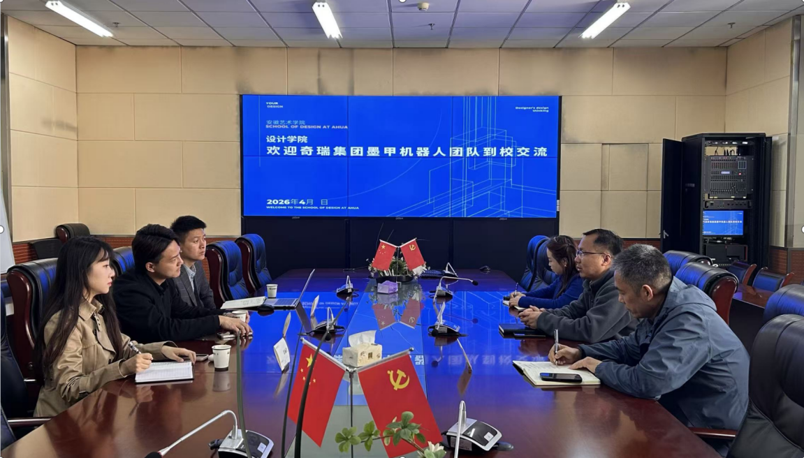 座谈会上,刘勇介绍学校与奇瑞集团前期合作成果,重点阐述数字创意设计产业学院在新能源汽车数字品宣、新媒体传播等领域的建设进展,强调设计学院正以省级“双特色”现代产业学院为依托,着力构建“艺术+科技+产业”的人才培养新模式。焦吉祥介绍墨甲机器人的发展历程、技术布局与产业应用场景,指出作为奇瑞集团布局人工智能与机器人领域的核心板块,双方在机器人新媒体传播、具身机器人界面设计、机器人外形设计等业务拥有广阔合作空间。双方就共建微专业、实习实训、师资互聘等达成一致认识,推动教育与产业精准对接、深度融合。