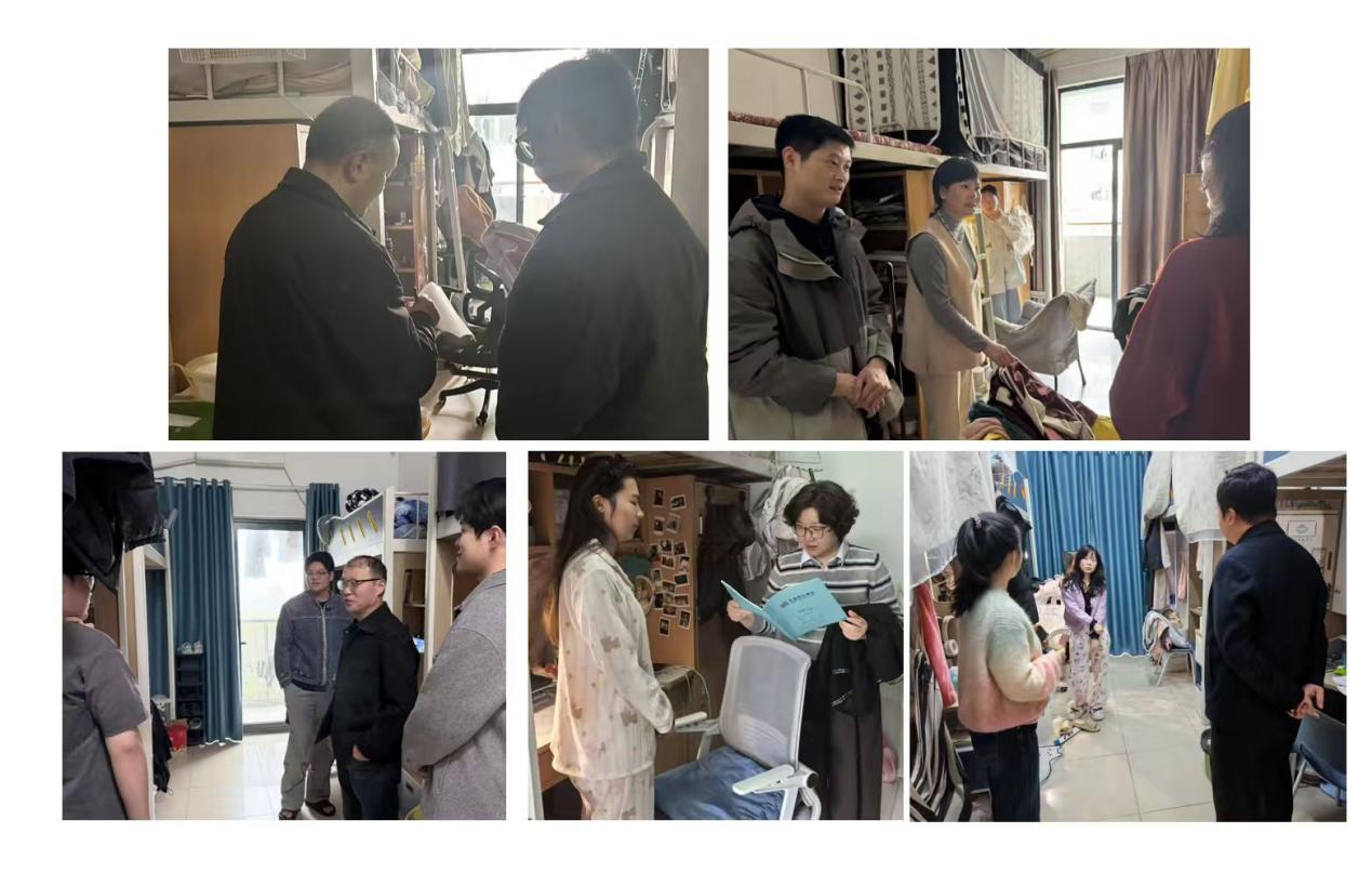 走访期间,老师们与宿舍同学亲切交流,了解学业、生活情况及思想动态,听取对学院工作的意见建议。重点排查宿舍用电安全、消防隐患,现场提醒整改不规范用电行为,指导督导文明创建工作,倡导共建整洁居住空间。