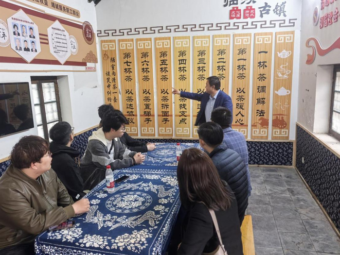 4月8日,师生一行前往临涣古镇继续调研。在南阁茶楼、怡心茶楼等特色茶馆,师生深度体验拥有六百余年传承历史的临涣棒棒茶文化,在氤氲茶香与乡音俚语、民间小调中,沉浸式感受皖北茶馆文化中的民间音乐生态,捕捉到最鲜活、最接地气的创作素材。
