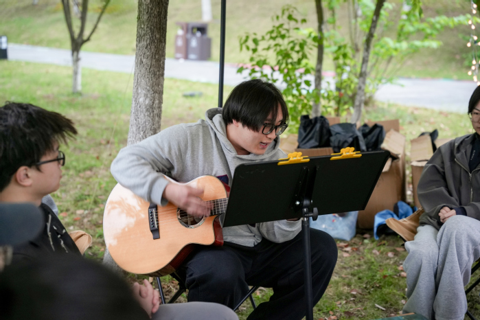 公共教学部的青年教师带着私藏书单与阅读故事,和同学们围坐分享阅读的感动;音乐学院的同学带来温柔的民谣弹唱,《去大理》《程艾影》的旋律伴着春风流淌;露天电影《那山那人 那狗》在树荫下播放,咖啡香与书香交织成独属于安艺的春日浪漫。