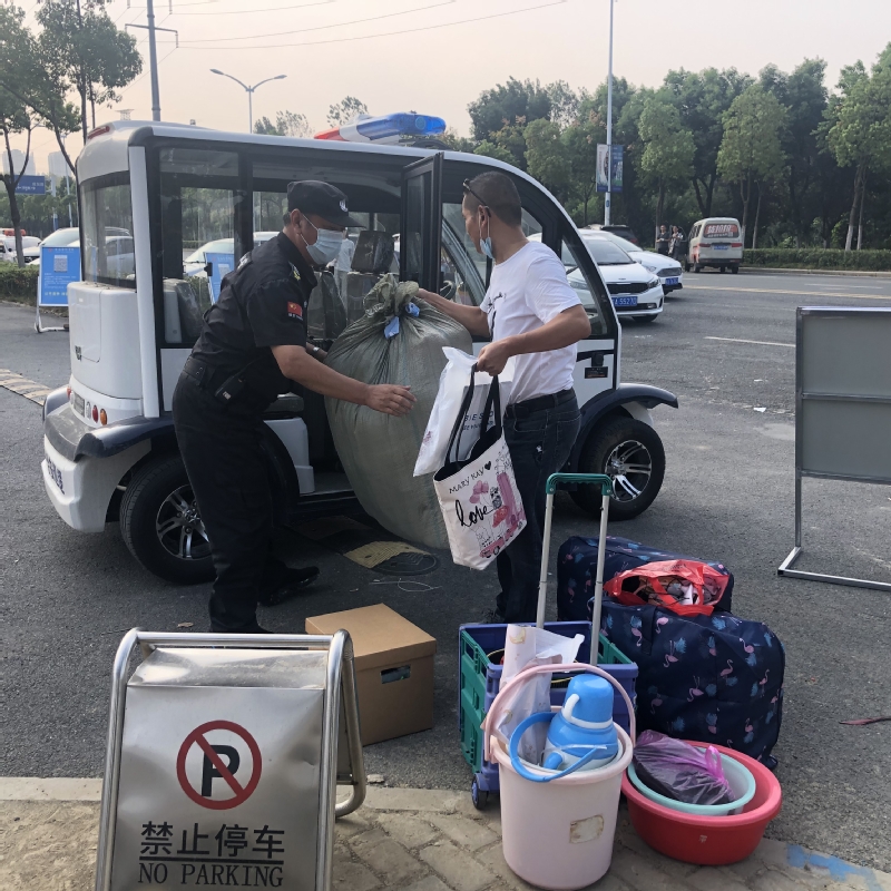 校内,教工车辆一律从西门进入。新生陆续报到,门岗防疫执勤人员热情又严格地执行防疫工作程序。下雨天,安保人员仍坚守岗位,组织新生有序入校。新生宿舍离校园北门较远,保安人员利用警务四驱车、三轮车、小货车作为新生的行李免费摆渡车,无论骄阳还是雨天,不辞辛苦地免费帮新生摆渡行李,深得师生、家长的赞同。