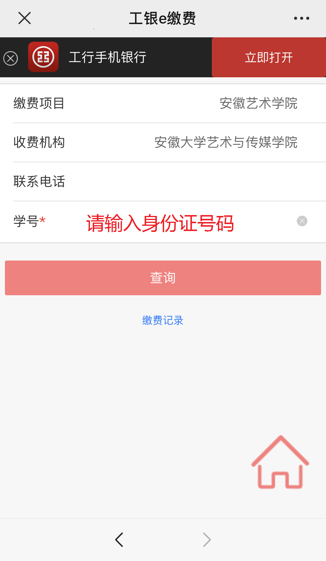 4.缴费项目选择安徽艺术学院,学号填写学生本人身份证号码,点击下一步。