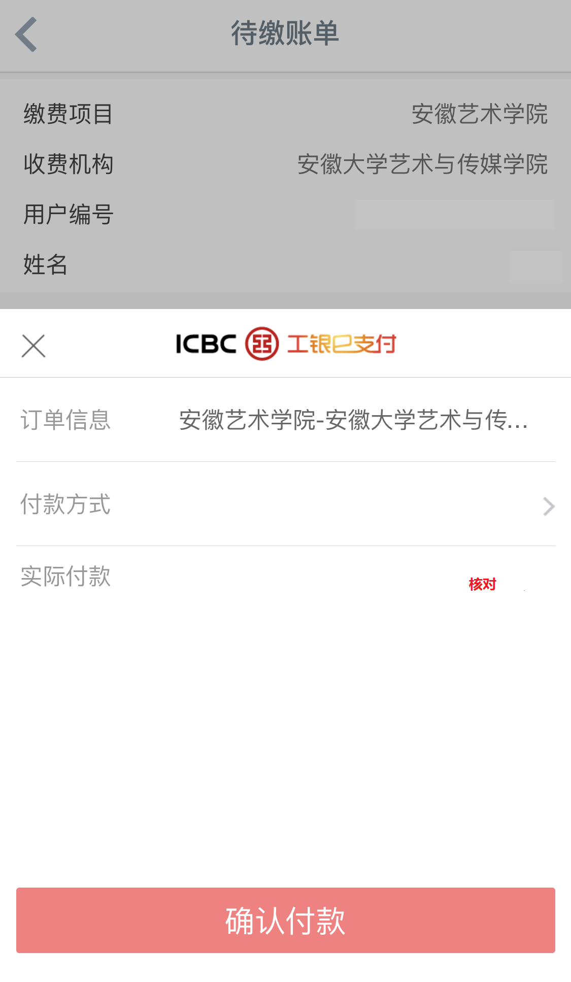 6.再次核对付款金额,确认无误后,点击确认付款,完成缴费。学生可通过查询银行卡明细确认缴费是否完成。