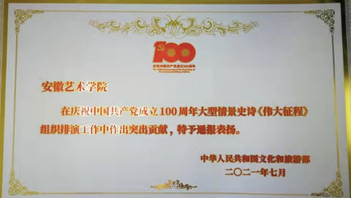 近日,中华人民共和国文化和旅游部对我校在庆祝中国共产党成立100周年大型情景史诗《伟大征程》组织排演工作中作出的突出贡献,予以通报表扬。