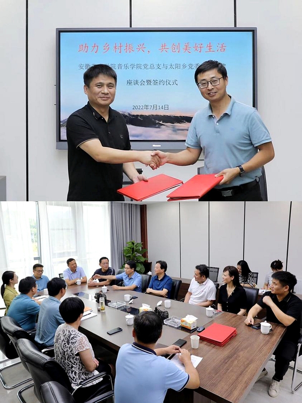 音乐学院党总支与太阳乡党委举行结对共建座谈会暨签约仪式。霍山县太阳乡党委书记、乡长李文龙,党委副书记刘会文等出席座谈会。