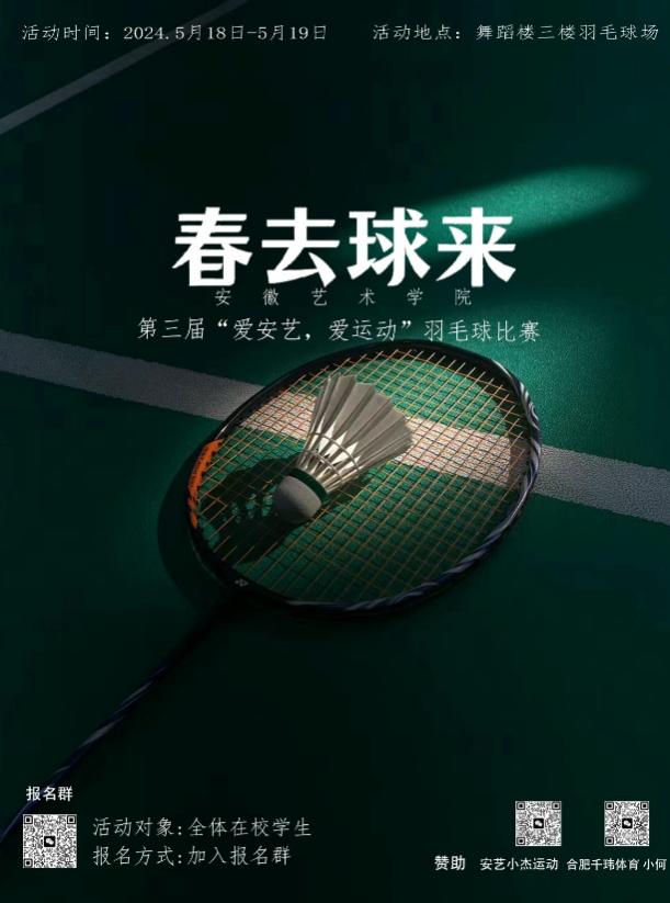 春去夏来,随着夏日的临近,最适合走出宿舍投身运动,在这个5月,羽毛球社团将举办以“春去球来,羽君同行”为主题的第三届“爱安艺,爱运动”羽毛球比赛。