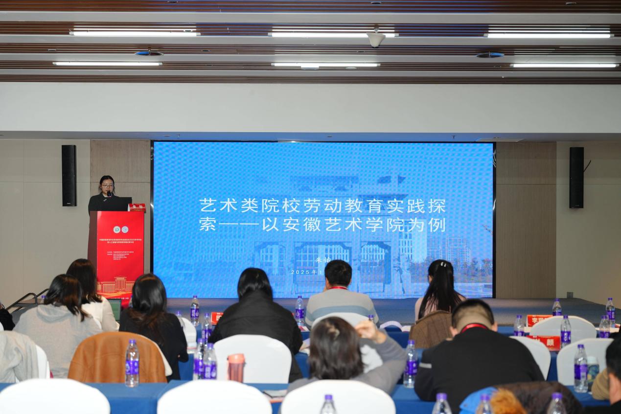 发言中,朱怡介绍安徽艺术学院劳动教育立足艺术类院校育人定位,以“立德树人、五育融合”为根本遵循,构建全域化、特色化劳动教育体系,为同类院校劳育实践提供参考范式。她指出,安徽艺术学院锚定“课程筑基、文化赋能、评价导向”三大维度,将劳动教育深度融入人才培养全链条:通过必修课程与“劳动周”营造校园劳育氛围,以“亲情劳动体验”打通家校社协同链路,借“劳艺融合”实现劳动与艺术专业实践互促。同时依托科研平台牵头制定劳育标准,建立过程性与综合性评价机制,强化了劳育成果应用。