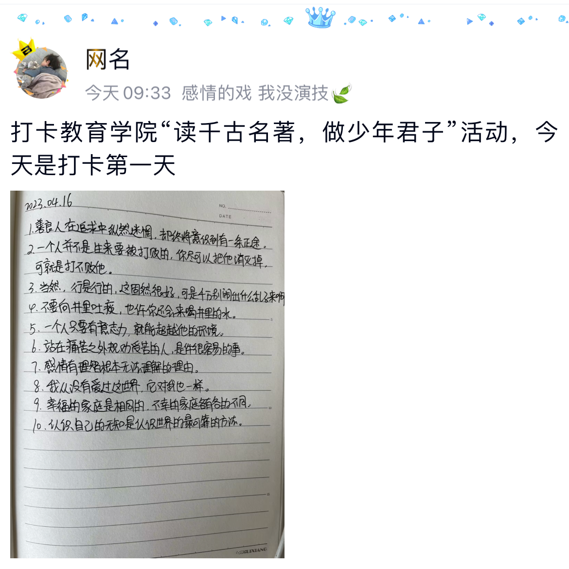 活动过程中,志愿者们每日坚持阅读,抄写下当天阅读中遇到的好词好句,记录自己的心得体会。与此同时,志愿者们以文字与图片结合的形式,将每日阅读成果拍照并上传至QQ空间,分享自己的阅读感悟。在阅读学习的过程中,志愿者们开阔了视野,在一本本名著中穿越时空,探寻中外历史文化的魅力,不断从贯通古今的古籍中汲取优秀的文化知识,获得精神的滋养与智慧的启迪。志愿者们表示,阅读帮助自己在闲暇时期体味人生百态、探索世界之终极,从而获得分享自己生活的全新视角,在今后也将用书香不断润泽自己的人生。