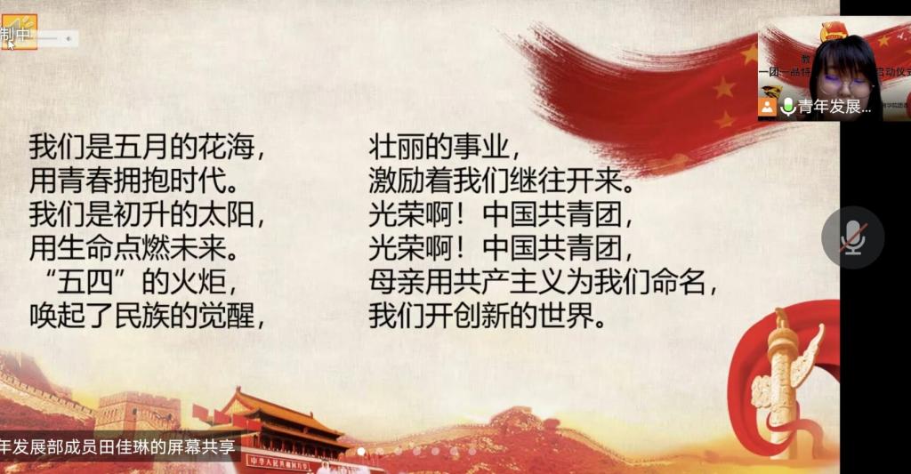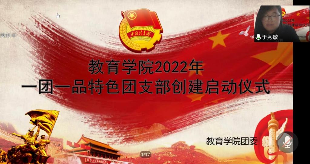 为了推动校园两个文明建设,创建具有长效性和影响力的特色团支部,同时进一步增强我院团员的凝聚力和责任感,2022年5月26日19:00,教育学院于线上举行2022年一团一品特色团支部创建启动仪式,团委书记于秀敏老师出席本次仪式。