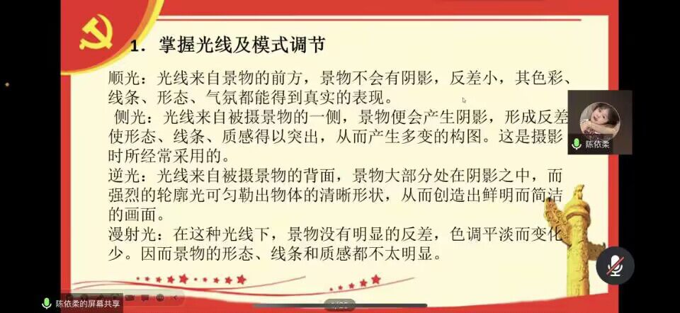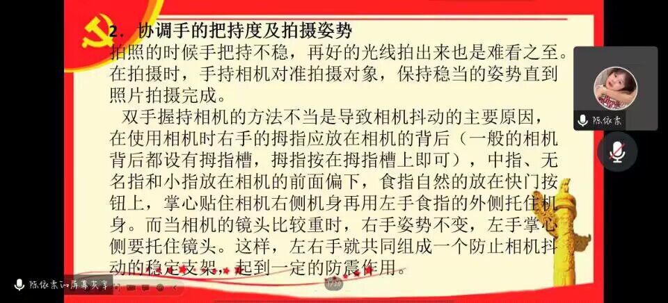 小学教育专业2101班的陈依柔同学担任本次培训会的主讲人,她从“掌握光线及模式调节”、“协调手的把持度及拍照姿势”、“取景构图”三个方面向学员详细介绍了拍照技巧,帮助学员感受摄影的魅力。随后,她结合以往的摄影经验,向学员们介绍了相机的使用方法,通过正反举例强调了拍摄时取景与构图的重要性。她指出,好的照片需要主题的完整性和色彩的和谐性,我们在摄影时需要稳定姿势,提前明确想要表达的主题,在不断的练习与打磨中寻找灵感,在生活中捕捉美好。