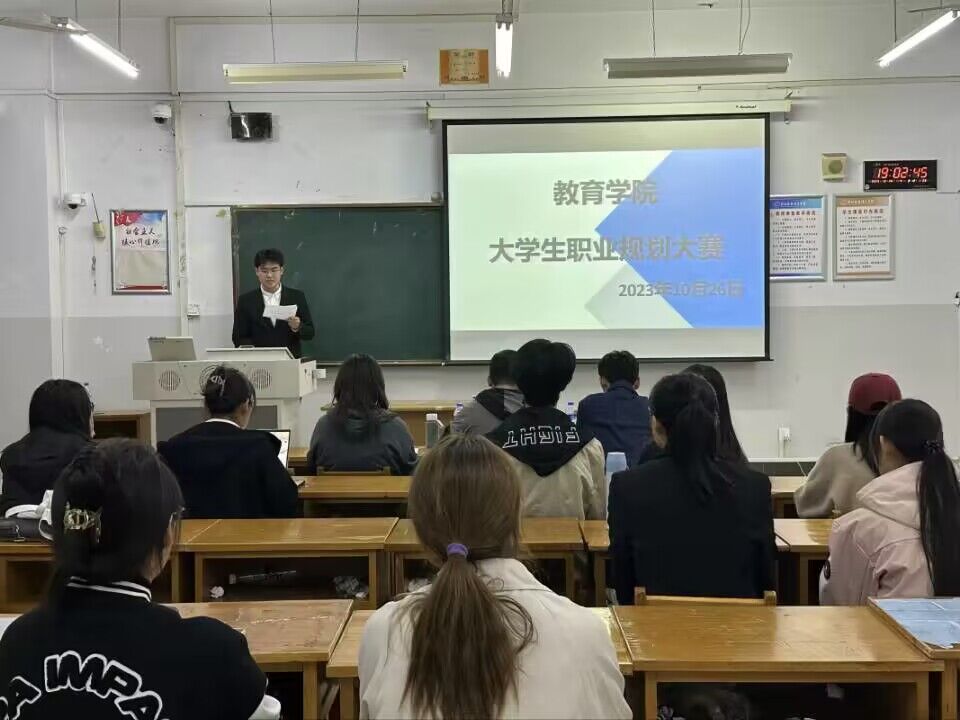 为引导大学生关注职业规划,探索未来职业发展方向,提升就业竞争力,2023年10月26日19:00,教育学院于综合楼教室开展大学生职业规划大赛 ,共有16名选手参与此次比赛,并有团委书记于秀敏老师、学工办副主任万玉良老师等五位老师莅临指导。