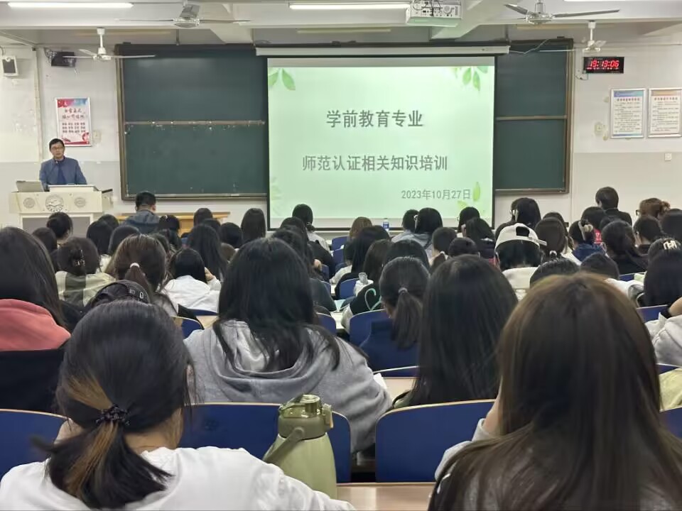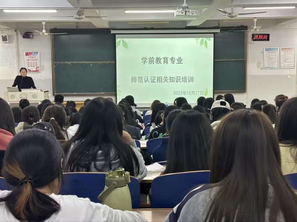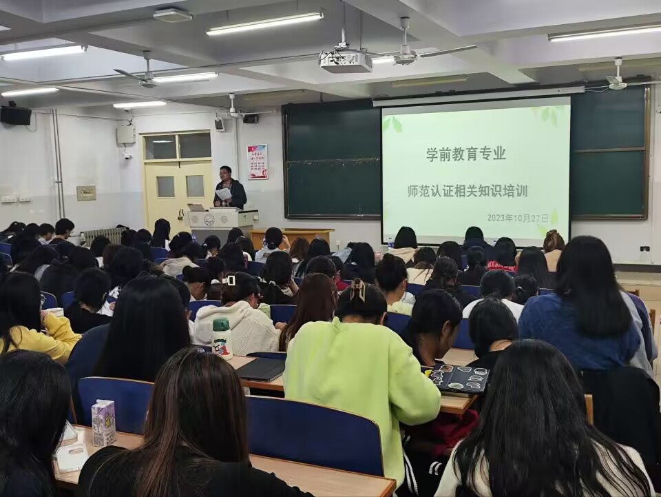 为迎接并顺利通过学前教育专业的师范认证。2023年10月27日19:00,学前教育专业全体学生在综合楼412教室进行师范认证相关知识培训。教育学院党委副书记、副院长孙华老师、教育学院副院长刘海华老师、学前教育专业带头人杨倩茜老师、学前教育教育部主任张罗斌老师、学工办团委书记于秀敏老师参加本次培训。