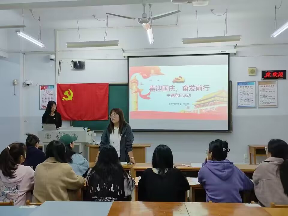 为弘扬爱国主义精神,激发爱国主义情感, 2023年10月24日晚上7:00,教育学院学生第一党支部组织本支部党员、预备党员于综合楼506教室开展“喜迎国庆,奋发前行”主题党日活动。
