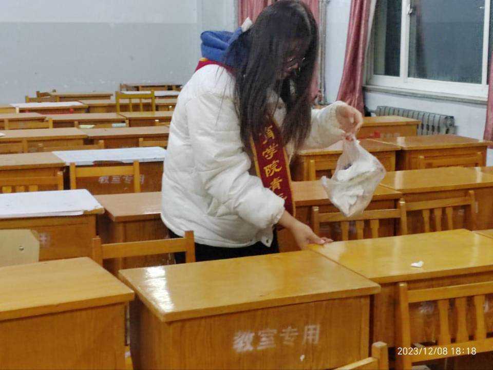 为提高教室卫生清洁质量,为同学们创造 干净、舒适、优美的学习环境,引导大家树立爱护环境的意识,进一步培养学生的公共卫生习惯。2023年12月8日18:30,教育学院青年志愿者协会计划开展“清理教室卫生,你我齐心协力”活动。