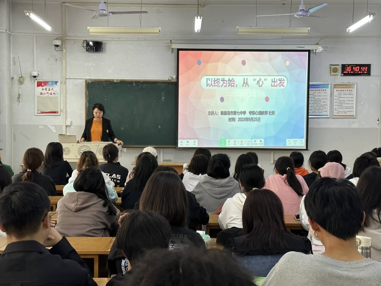 为加深同学们对心理学的了解,解答同学们对自身专业的疑惑,提升同学们对未来规划的能力,2023年9月25日16:30,应用心理学专业于综合楼404教室开展《以始为终,从“心”出发》新生入学教育活动,特邀秦皇岛市第七中学专职心理教师杜跃老师前来给学生们做讲座。应用心理学专业指导教师及全体新生参与本次活动。