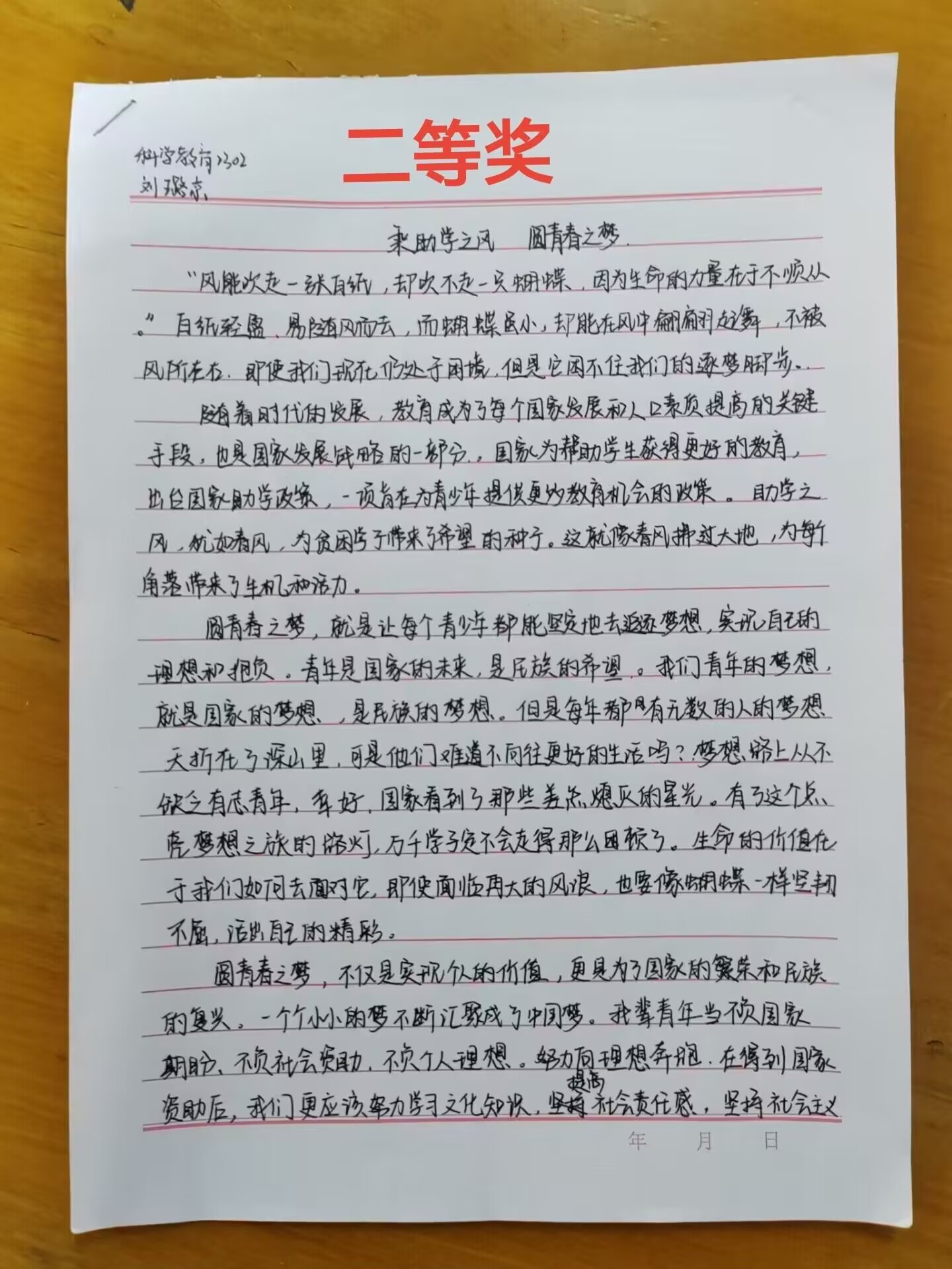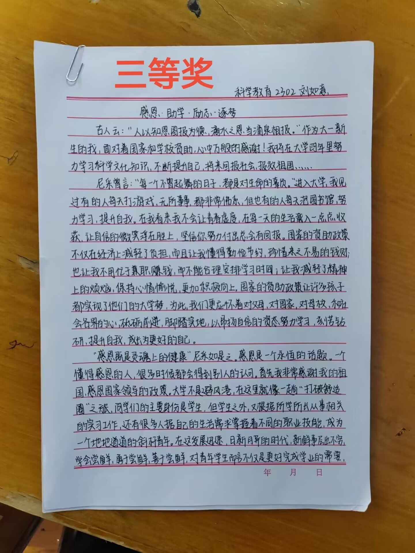 活动过程中,学生们积极报名参加,通过网络等途径认真学习有关学生资助的政策、信息,结合自己的感想或自身经历写成文章。同学们的一笔一划体现了他们对于资助政策的感知与理解,通过此次活动充分感受到国家给予的温暖和力量.作为新时代青年,我们要常怀感恩之心,树立远大理想,为实现中华民族伟大复兴不懈奋斗。