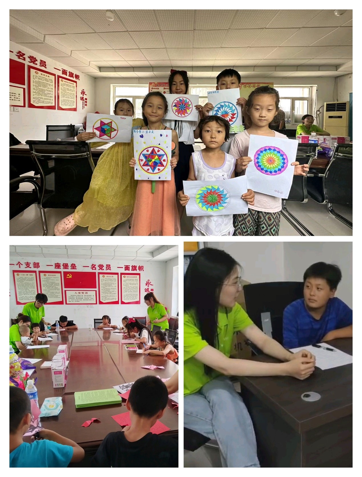 应用心理学专业的团队成员依据所学专业知识,对每个留守儿童进行了心理测试,并根据每一位留守儿童的心理测试结果对他们进行了相对应的心理辅导,同时也带领留守儿童们一起完成了曼陀罗画,解决留守儿童们面临的心理问题,促进了他们的健康发展。