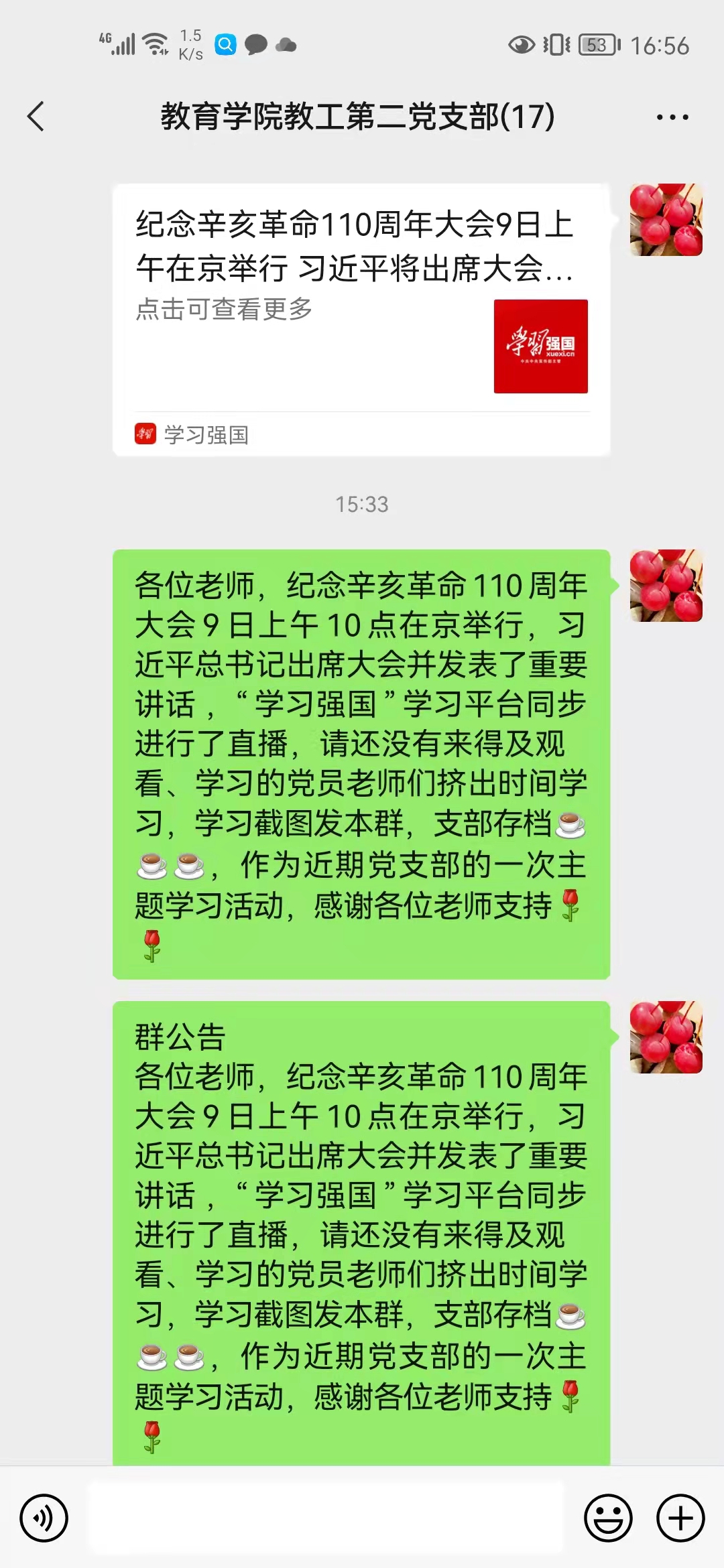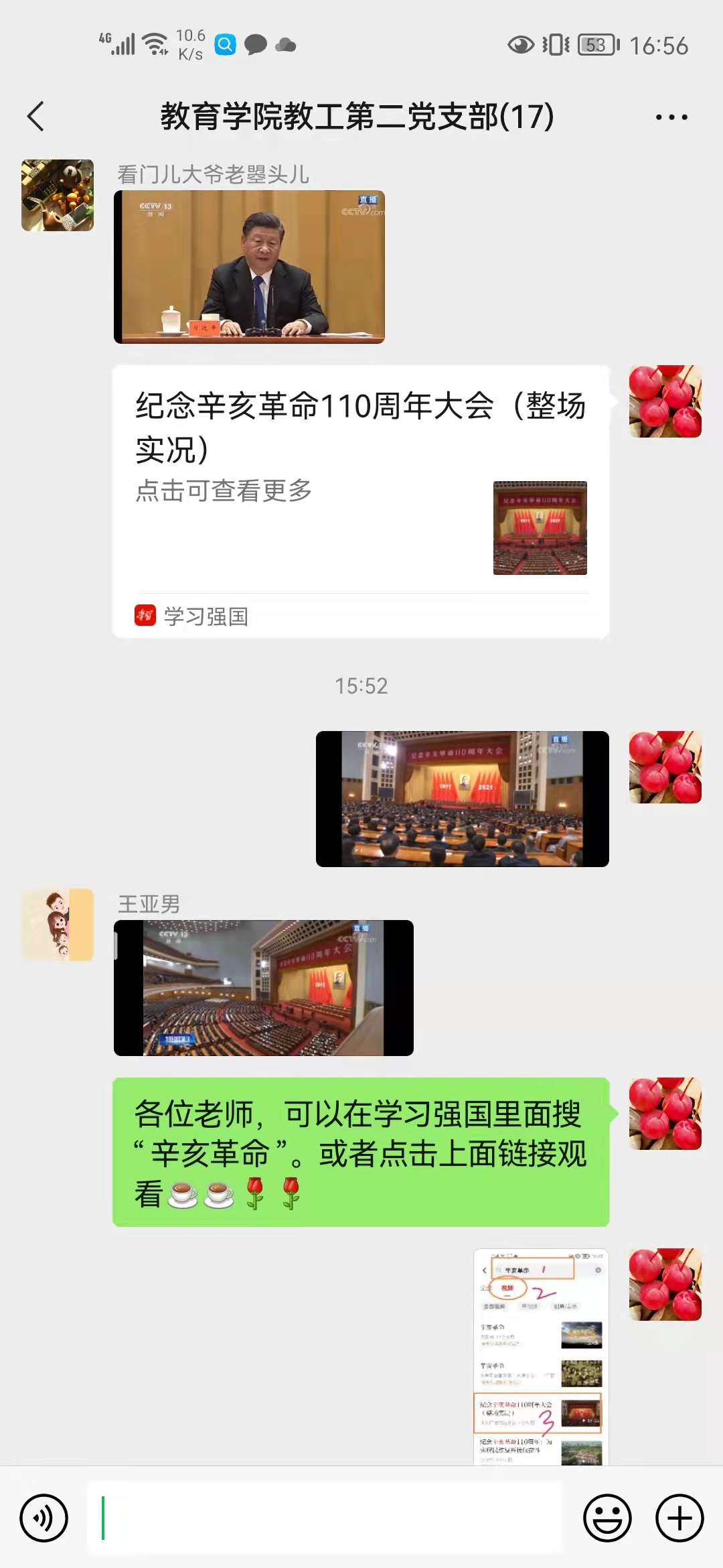 纪念辛亥革命110周年大会9日上午10点在京举行,习近平总书记出席大会并发表了重要讲话 。我院教工第二党支部依托“学习强国”平台进行了线上专题学习。
