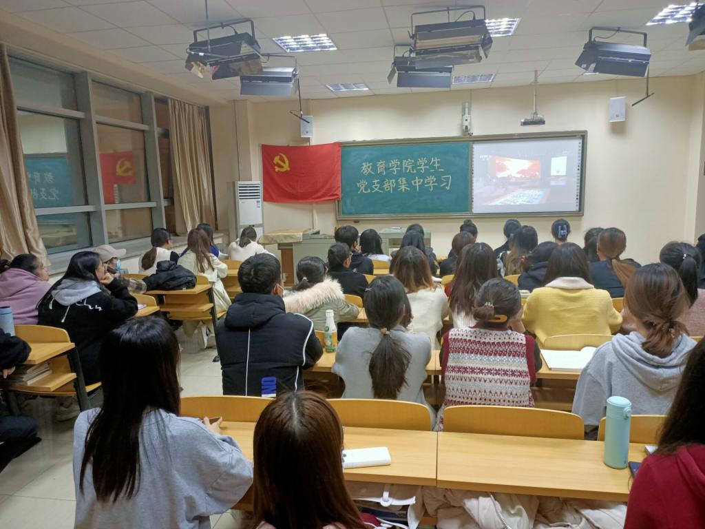 为深入学习贯彻习近平总书记在庆祝中国共产党成立100周年大会上的重要讲话精神,持续推动党史学习教育走深走实,增强党员干部的责任感、使命感,2021年10月24日晚8:00,教育学院学生党支部组织61名学生党员齐聚504教室,共同学习观看了《党课开讲啦》节目第二期《伟大的建党精神》。