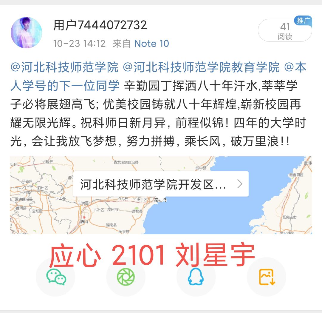 大一大二全体同学提前在手机上下载好微博APP,同时关注了河北科技师范学院官方微博与河北科技师范学院教育学院微博,并于活动当天在微博上发表了自己对母校80岁生日的祝福语。以念为信,以情封笺,同学们将对母校的爱诉诸笔端,那一句句真挚的感言,一段段动人的视频,都是属于教院人的独家记忆。活动结束后,工作人员将同学们上传的打卡截图分类别进行了整理汇总。