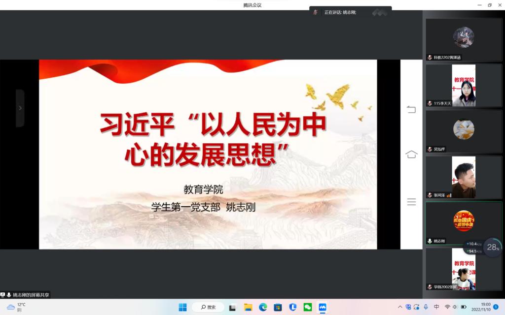 11月10日19:00,教育学院学生第一党支部书记、小学教育教学部主任姚志刚老师为学院第二十一期党校培训班讲授第八讲,本次党课的主题为“以人民为中心的发展思想”,学院学生党员、师生积极分子和发展对象共146人线上参加学习。