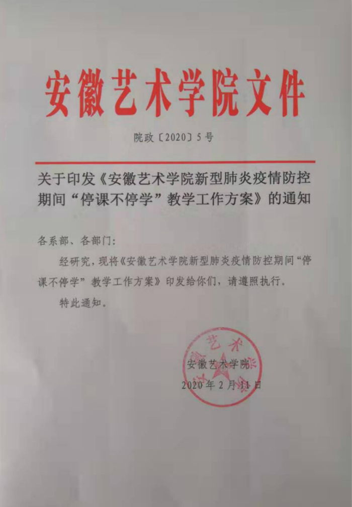 鉴于目前新型冠状病毒感染的肺炎疫情形势,为贯彻教育部《关于2020年春季学期延期开学的通知》和安徽省人民政府办公厅《关于延迟企业复工和学校开学的通知》精神,落实安徽省教育厅《关于高等学校在新型冠状病毒感染的肺炎疫情防控期间开展线上教学的指导意见》的统一要求,在保障全校师生健康安全的前提下,结合我校实际,组织师生停课期间以线上教学、自学等方式“停课不停学”,特制订本工作方案。