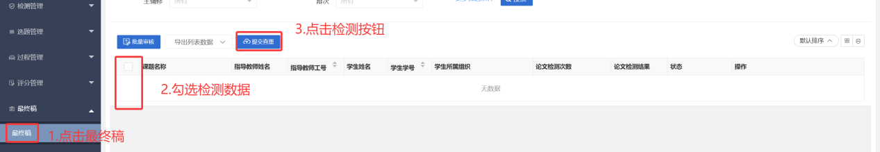 线下答辩后,学生在毕设系统内上传最终稿稿件。指导教师审核通过后学院统一进行检测。教学科研办主任勾选需要检测的学生后点击左上角“提交查重”按钮进行检测,最终稿作为存档材料请注意确保内容和格式以及检测重复率须达到学校要求。