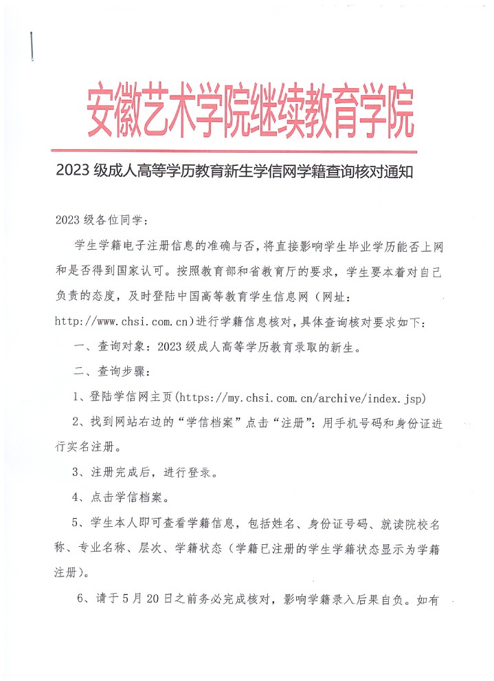 2023级成人高等学历教育新生学信网学籍查询核对通知