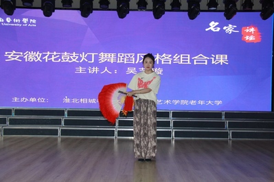 仪式结束后,安徽艺术学院舞蹈学院教师吴艺璇开展《安徽花鼓灯舞蹈风格组合课二》的课程教学。在前期课程的基础上,吴老师带老年学员们复习了平足步、执扇方式等基础动作,对安徽花鼓灯的组合动作进行完整的教学。课程现场,吴老师与老年学员们共同演绎了一场视觉盛宴。