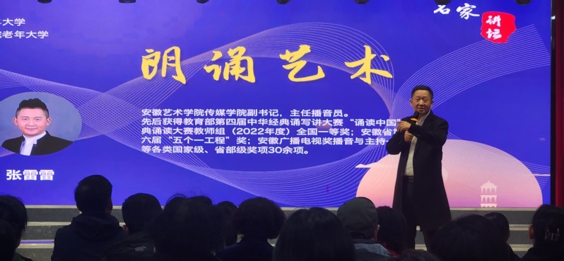 11月10日下午,安徽艺术学院老年大学在淮北相城老年大学教学点的本学期“名家讲堂”第二期开课,我校传媒学院张雷雷副教授赴淮北相城老年大学教学点,作《朗诵艺术》名师讲坛专家讲座,现场座无虚席。