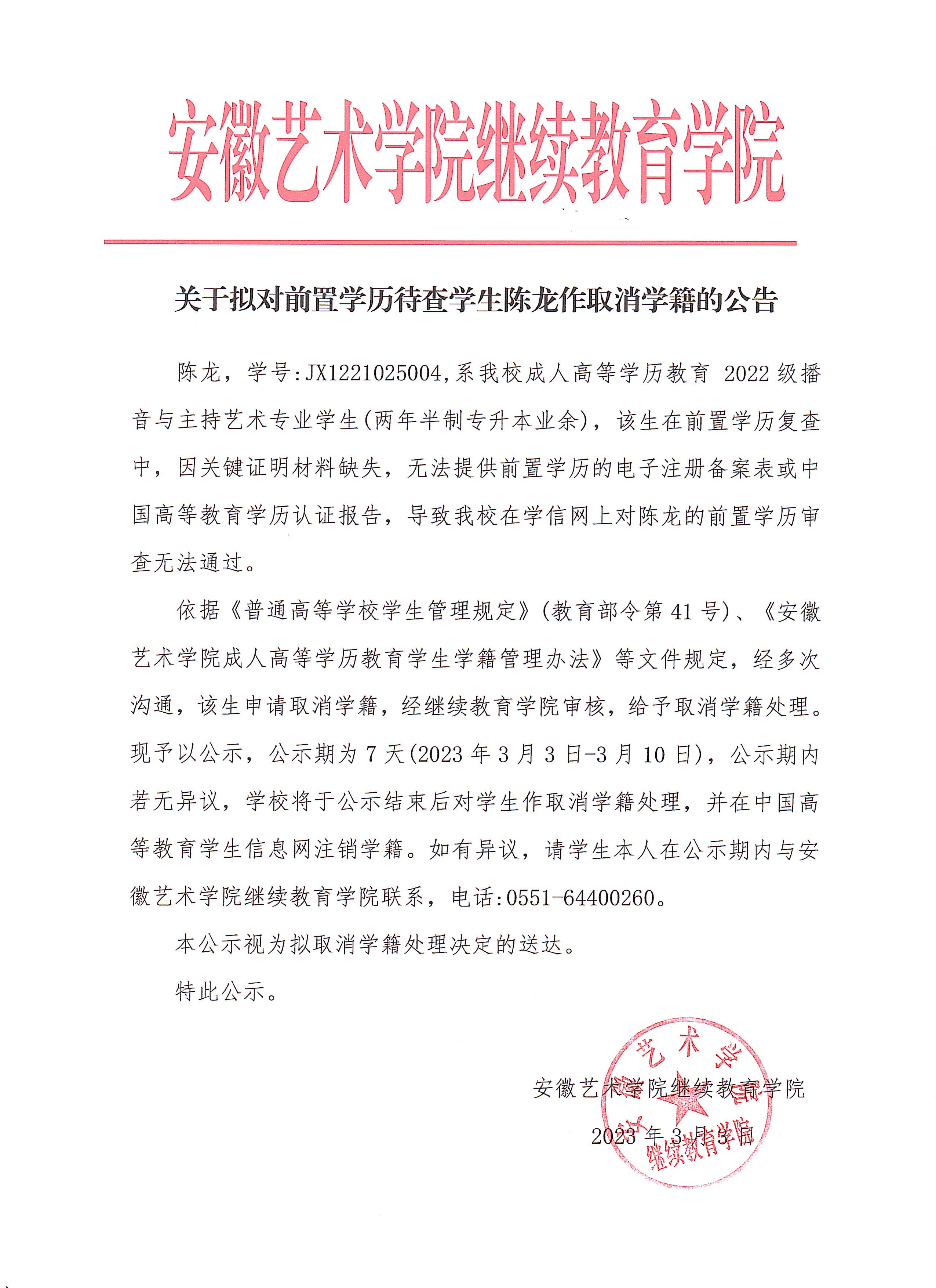 关于拟对前置学历待查学生陈龙作取消学籍的公告