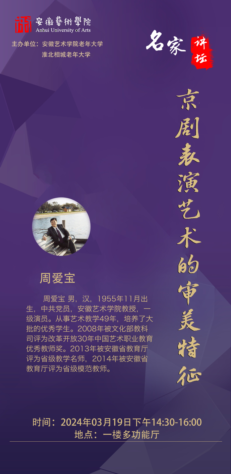 3月19日,安徽艺术学院在淮北教学点开展了2023-2024学年第二学期的“名家讲坛”活动。我校周爱宝教授以《京剧表演艺术的审美特征》为主题,向老年大学学员们呈现了一场生动的专题讲座。