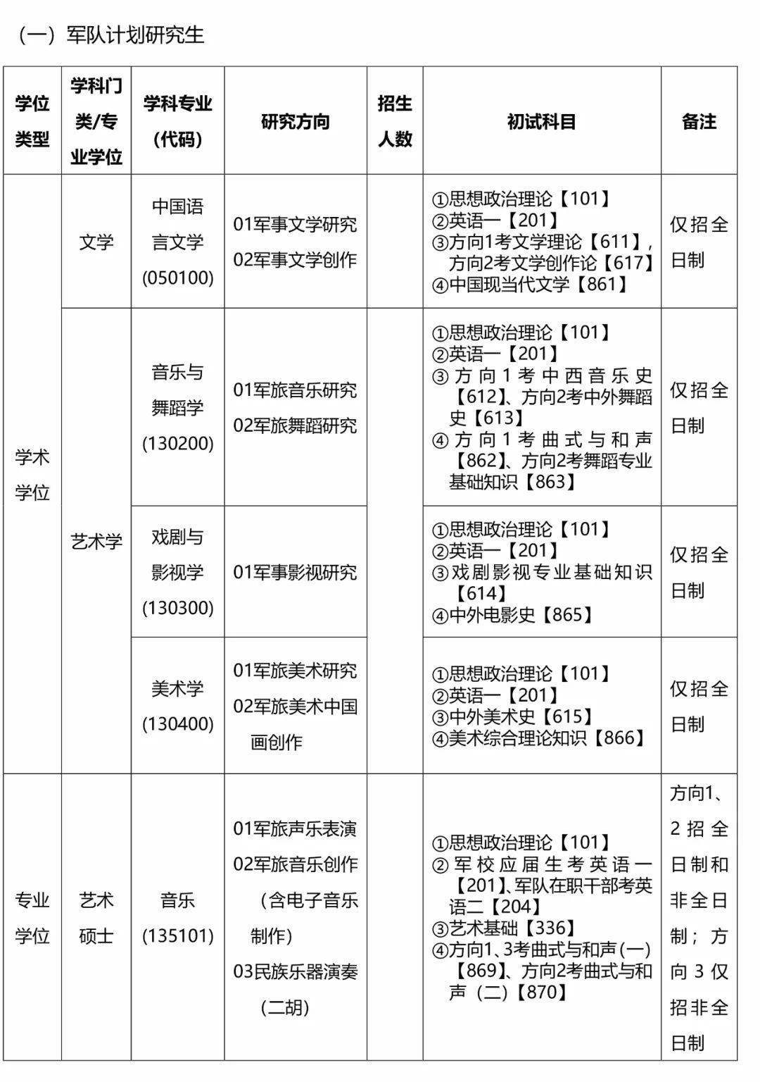 6.报考我院艺术硕士专业学位研究生所有研究方向和学术学位研究生7个研究方向(军事文学创作、军旅声乐表演、军旅舞蹈表演、军旅戏剧影视表演、军旅美术中国画创作、军旅美术油画创作、军旅视觉传达设计),须具备创作表演实践经验,并达到我院相关专业方向招收硕士研究生所需的专业水平。专业水平考(审)核于研招网正式报名结束前组织,由学院成立相应专业方向导师组实施。未参加我院专业水平考(审)核,或参加考(审)核但未通过者,不予核发准考证。专业水平考(审)核有关要求如下: