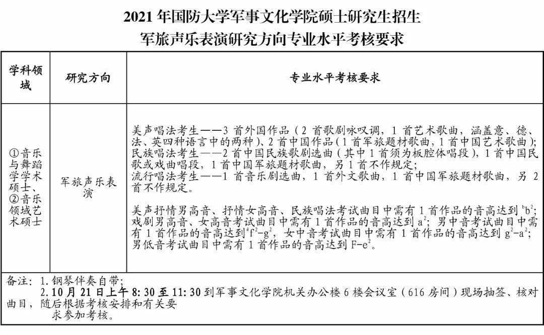 8.报考军旅声乐表演、民族乐器演奏(二胡)方向考生,初定于10月21日下午组织专业水平考核。考生应于10月19日12:00前提交考核申请。民族乐器演奏(二胡)考生须现场演奏3首独奏乐曲,其中1首为协奏曲(至少1个乐章),军旅声乐表演方向考生考核有关曲目等要求详见《军旅声乐表演研究方向专业水平考核要求》。考核的具体安排,届时根据报考情况提前通知考生。