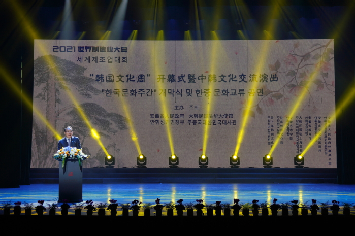 金胜镐宣布韩国文化周正式开幕。他在致辞中表示,世界制造业大会是一个促进两国文化交流的契机,可以达到“你中有我,我中有你”。韩中两国有悠久的历史渊源,希望能通过这一场活动,让缘分更加深厚。