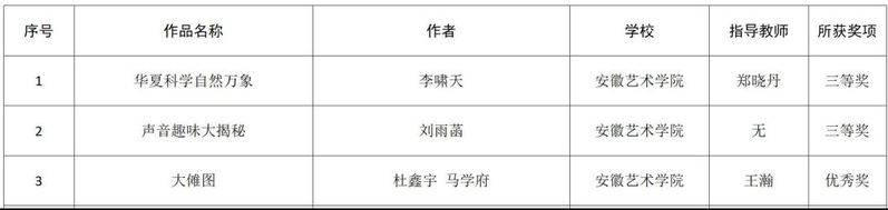 近日,由安徽省科协、安徽省教育厅、共青团安徽省委联合举办的第十六届安徽省百所高校百万大学生科普创意创新大赛优秀科普作品获奖名单公布,我校报送的参赛作品荣获三等奖2项、优秀奖1项。
