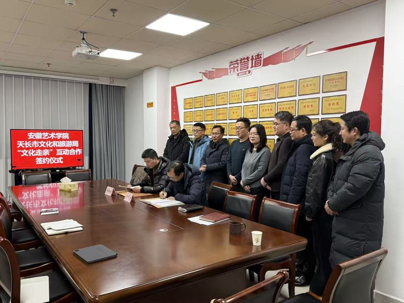 在天长市文化和旅游局,该局局长李晓明主持座谈会。双方认为,结合安徽艺术学院的学科人才优势和天长的文化历史底蕴、经济社会发展情况,开展多学院、跨学科联合,一是文化IP开发,围绕“孝”文化、包拯职场首任地、王贞仪科学家精神、茉莉花民歌等本土文化,打造“天长记忆”IP矩阵;二是产业赋能,通过数字艺术设计提升毛绒玩具小镇产品附加值,联合开发“非遗体验馆”(如徽派剪纸、天长刻纸);三是人才共育,共建实习就业基地,培养文旅策划、新媒体运营人才;四是艺术科技应用,运用VR复原金牛湖古场景、灯光秀点亮夜游经济,同步推进青年文旅短视频创作大赛,吸引年轻群体关注。